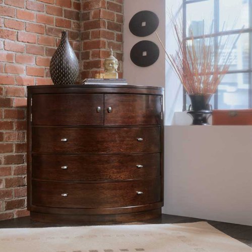 Elegantly designed with a solid and permanent appearance, the Tribecca Corner Chest is an excellent choice for bedroom storage needs. It features an upper compartment with two doors and three lower drawers for ample storage. With classic clean lines and pared down forms, the Tribecca Corner Chest's inviting textures, rich wood tones and nickel finish hardware could be just the fresh look you've been trying to imagine for your bedroom suite. Sublimely adaptable, the Tribecca Collection by American Drew fuses the simplicity of Mission wood crafting with updated urban and Japanese influences for a beautifully simple look that will enhance any decor, from the traditional to the trendy. Features: Corner Chest made of cherry veneers and select hardwoods Root Beer color finish Three spacious drawers Metal ball bearing drawer guides Upper compartment with two doors Nickel finish hardware Contemporary style Manufacturer 1-year warranty against defects in material and workmanship under conditions of normal use Specifications: Overall Dimensions: 50" H x 42" W x 26" D Wall Space Required: 29.88" (each side) Upper Compartment Dimensions: 11" H x 38" W x 25" D Weight: 204 lbs Recommended Care: Dust with a soft clean cloth slightly moistened with water; always rub in the direction of the wood grain Avoid hot dishes, moisture and harsh solvents Do not place beverages and pliable materials on wood surfaces Furniture should not be placed near heat source or in direct sunlight